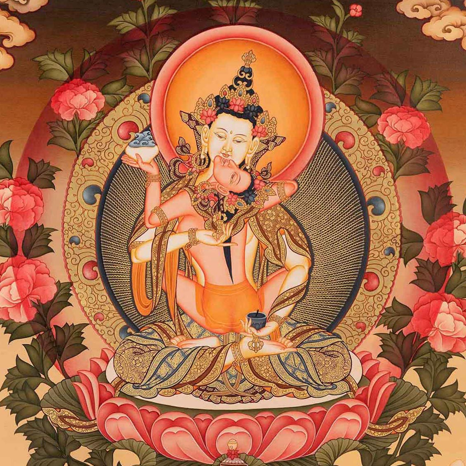 Een diep symbolisch beeld dat deze energetische uitwisseling belichaamt is de yab-yum-houding. Deze houding — waarbij de mannelijke figuur (yab) in meditatieve zit wordt omarmd door de vrouwelijke figuur (yum), die op zijn schoot zit, vaak in een intieme en volledig verbonden houding — is een visuele representatie van de vereniging van tegenpolen: bewustzijn en energie, het mannelijke en het vrouwelijke principe.